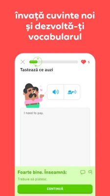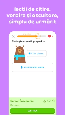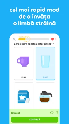 Concepută de lingviști și pedagogi de top, Duolingo transformă învățarea într-o aventură captivantă, bazată pe principii științifice solide care asigură memorarea pe termen lung. Lecțiile noastre interactive, pline de provocări sub formă de jocuri și personaje carismatice, te vor ajuta să-ți dezvolți fluent abilitățile de conversație, lectură, scriere și ascultare. Fiecare pas este marcat de recompense și obiective clare, transformând efortul într-un obicei zilnic plin de satisfacții și motivându-te să atingi noi culmi lingvistice.