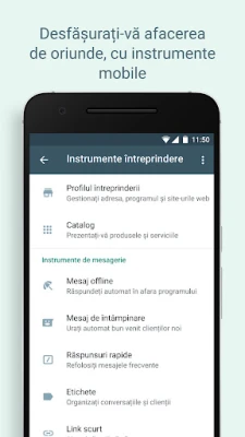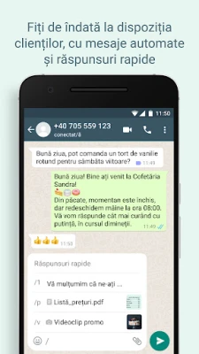 Optimizați-vă fluxul de lucru și maximizați productivitatea. Prin WhatsApp Business, aveți la dispoziție răspunsuri rapide automate și mesaje programate pentru perioadele de inactivitate, asigurându-vă că nicio oportunitate de conectare nu este pierdută. Organizați conversațiile esențiale cu ajutorul etichetelor personalizabile, facilitând filtrarea și regăsirea rapidă a informațiilor. Creați un profil de afaceri profesional și sigur, care validează credibilitatea mărcii dumneavoastră, iar pentru o autentificare sporită, opțiunea Verificat de Meta vă permite să construiți o loialitate profundă. Anunțați oferte și noutăți direct prin funcția de Stare, menținând audiența constant informată și angajată.