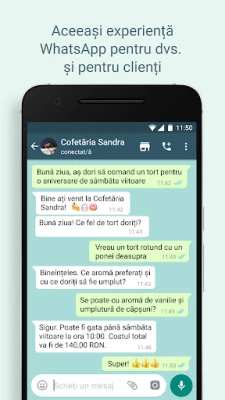 WhatsApp Business redefinește interacțiunea comercială, combinând familiaritatea unei platforme globale de mesagerie cu instrumente integrate, special concepute pentru succesul afacerii dumneavoastră. Această soluție este creată pentru a vă ajuta să operați cu inteligență sporită, să consolidați încrederea clienților și să stimulați o dezvoltare sustenabilă. Beneficiați de apeluri și mesagerie internațională nelimitată, eficientizând comunicarea cu partenerii și clienții la nivel global, eliminând barierele geografice fără costuri suplimentare pentru comunicare.